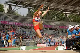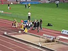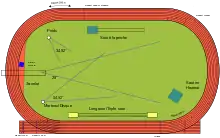 Le 3 000 m steeple allie l'endurance au franchissement de haies. Il fut d'ailleurs conçu par le biais d'un pari entre étudiants, en référence au sport hippique britannique très en vogue à la fin du XIXe siècle[42]. Les athlètes doivent parcourir sur la piste la distance de 3 000 m et franchir par ailleurs différents obstacles, les haies et la rivière. Depuis peu, le 3 000 m steeple est ouvert aux femmes et a figuré pour la première fois au programme olympique en 2008