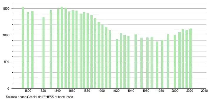 L'évolution du nombre d'habitants est connue à travers les recensements de la population effectués dans la commune depuis 1793. Pour les communes de moins de 10 000 habitants, une enquête de recensement portant sur toute la population est réalisée tous les cinq ans, les populations légales des années intermédiaires étant quant à elles estimées par interpolation ou extrapolation[29]. Pour la commune, le premier recensement exhaustif entrant dans le cadre du nouveau dispositif a été réalisé en 2005[30].