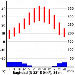 Le climat désertique de Bagdad en fait l'une des plus chaudes régions du monde pendant l'été, surtout quand le vent du golfe Persique souffle (on atteint environ 45 °C en juillet). En hiver, la pluviosité est de 136 mm[7] et le thermomètre oscille en moyenne entre 6 et 18 °C en décembre, et entre 4 et 16 °C en janvier. Il y a une douzaine de jours de gel par an, avec des températures parfois assez basses (minimum de −6 °C)[8].