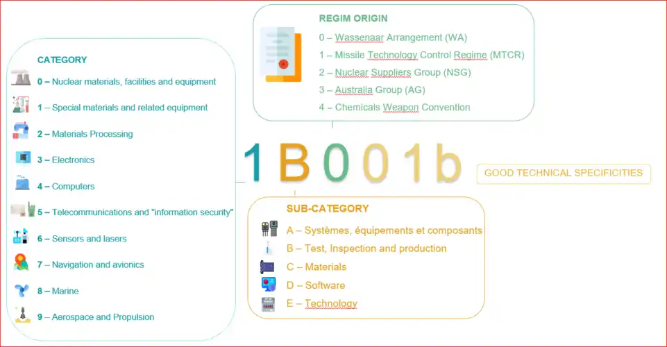 Les différentes catégories de biens à double usage sont codifiées par 5 à 6 caractères alphanumériques.
