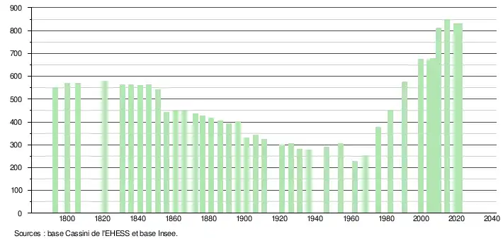 L'évolution du nombre d'habitants est connue à travers les recensements de la population effectués dans la commune depuis 1793. Pour les communes de moins de 10 000 habitants, une enquête de recensement portant sur toute la population est réalisée tous les cinq ans, les populations légales des années intermédiaires étant quant à elles estimées par interpolation ou extrapolation[18]. Pour la commune, le premier recensement exhaustif entrant dans le cadre du nouveau dispositif a été réalisé en 2004[19].