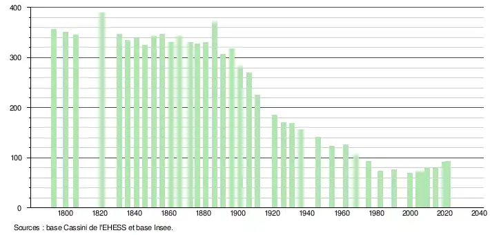 L'évolution du nombre d'habitants est connue à travers les recensements de la population effectués dans la commune depuis 1793. Pour les communes de moins de 10 000 habitants, une enquête de recensement portant sur toute la population est réalisée tous les cinq ans, les populations légales des années intermédiaires étant quant à elles estimées par interpolation ou extrapolation[48]. Pour la commune, le premier recensement exhaustif entrant dans le cadre du nouveau dispositif a été réalisé en 2004[49].
