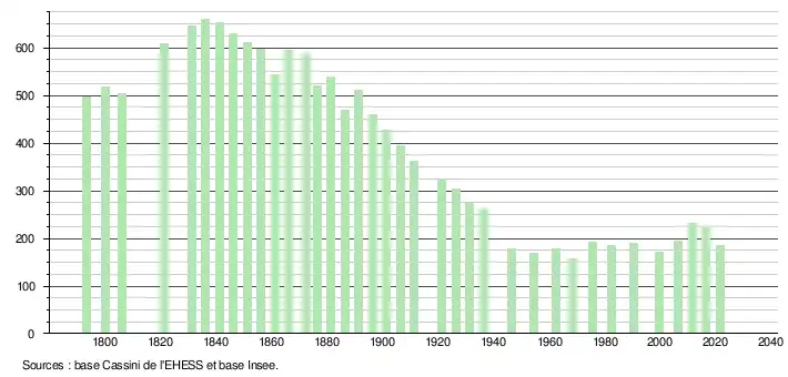 L'évolution du nombre d'habitants est connue à travers les recensements de la population effectués dans la commune depuis 1793. Pour les communes de moins de 10 000 habitants, une enquête de recensement portant sur toute la population est réalisée tous les cinq ans, les populations légales des années intermédiaires étant quant à elles estimées par interpolation ou extrapolation[29]. Pour la commune, le premier recensement exhaustif entrant dans le cadre du nouveau dispositif a été réalisé en 2006[30].