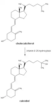 La conversion de la vitamine D, en particulier du cholécalciférol, en 25(OH)D (calcifediol) est l'une des étapes clés du système hormonal de la vitamine D. On pensait auparavant que l'activité enzymatique du CYP2R1 réalisant ce processus était exprimée de manière constitutive et stable, de sorte que le sérum 25(OH)D était une mesure de l'apport de vitamine D[9].