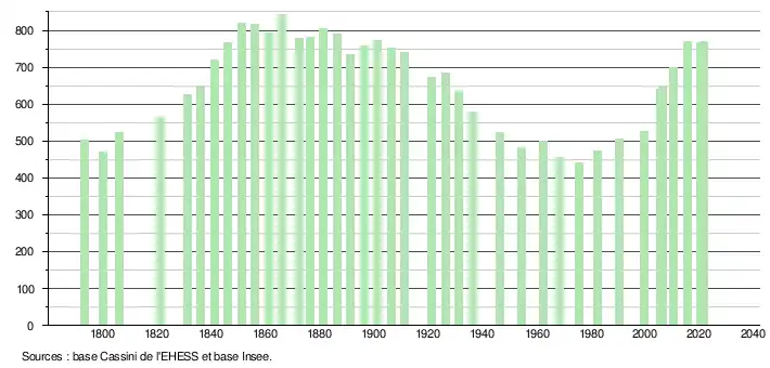 | L'évolution du nombre d'habitants est connue à travers les recensements de la population effectués dans la commune depuis 1793. Pour les communes de moins de 10 000 habitants, une enquête de recensement portant sur toute la population est réalisée tous les cinq ans, les populations légales des années intermédiaires étant quant à elles estimées par interpolation ou extrapolation[26]. Pour la commune, le premier recensement exhaustif entrant dans le cadre du nouveau dispositif a été réalisé en 2005[27]. En 2021, la commune comptait 770 habitants[Note 3], en augmentation de 0,13 % par rapport à 2015 (Landes : +4,9 %, France hors Mayotte : +1,84 %). |