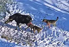 • La poursuite : Dans la continuité de l'assaut, les loups tentent de rattraper leur proie et de la tuer[88]. Quand ils chassent une petite proie, les loups tentent de la rejoindre le plus vite possible, tandis qu'avec des animaux plus grands, la poursuite est volontairement prolongée pour les épuiser. En général, les loups abandonnent la poursuite après 1 ou 2 kilomètres, même si un individu a déjà été observé à la poursuite d'un cerf sur 21 km[81]. Les loups, à la fois en Russie et en Amérique du Nord, ont aussi été observés en train de conduire leur proie sur des croûtes de glace, vers des précipices, des ravins, des pentes et des escarpements afin de la ralentir[89].