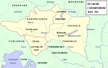 La principauté médiévale était centrée sur l’actuel land de Carinthie et la Carinthie slovène, tout en englobant également quelques zones voisines de la Styrie et Basse-Styrie, du Tyrol oriental, de la région du Lungau et du Pongau dans le land de Salzbourg, de la Basse-Autriche et de la Haute-Autriche. Selon certaines sources, comme les écrits de Paul Diacre, un autre État slave, la Carniole (Kranjska), apparut au VIIIe siècle au sud de la principauté, de l’autre côté du massif des Caravanques. Ce pays qui fut aussi à l’origine d’une marche et d’un duché par la suite.