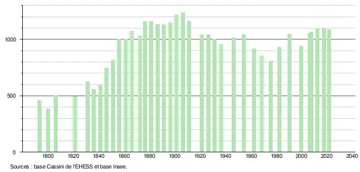 L'évolution du nombre d'habitants est connue à travers les recensements de la population effectués dans la commune depuis 1793. Pour les communes de moins de 10 000 habitants, une enquête de recensement portant sur toute la population est réalisée tous les cinq ans, les populations légales des années intermédiaires étant quant à elles estimées par interpolation ou extrapolation[16]. Pour la commune, le premier recensement exhaustif entrant dans le cadre du nouveau dispositif a été réalisé en 2007[17].