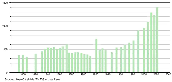 L'évolution du nombre d'habitants est connue à travers les recensements de la population effectués dans la commune depuis 1793. Pour les communes de moins de 10 000 habitants, une enquête de recensement portant sur toute la population est réalisée tous les cinq ans, les populations légales des années intermédiaires étant quant à elles estimées par interpolation ou extrapolation[16]. Pour la commune, le premier recensement exhaustif entrant dans le cadre du nouveau dispositif a été réalisé en 2006[17].
