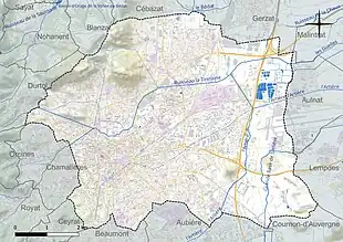 Douze communes sont limitrophes de Clermont-Ferrand[10] : Les communes limitrophes sont Blanzat, Aubière, Aulnat, Beaumont, Cébazat, Ceyrat, Chamalières, Cournon-d'Auvergne, Durtol, Gerzat, Lempdes et Orcines.