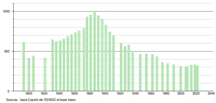 L'évolution du nombre d'habitants est connue à travers les recensements de la population effectués dans la commune depuis 1793. Pour les communes de moins de 10 000 habitants, une enquête de recensement portant sur toute la population est réalisée tous les cinq ans, les populations légales des années intermédiaires étant quant à elles estimées par interpolation ou extrapolation[16]. Pour la commune, le premier recensement exhaustif entrant dans le cadre du nouveau dispositif a été réalisé en 2008[17].