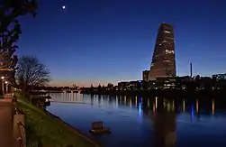 Bâle, troisième ville avec 173 552 habitants (2024)[53], se trouve au nord-ouest du pays. L'agglomération se développe également de l'autre côté de la frontière, en France et en Allemagne. La ville est traversée par le Rhin et dispose de l'unique port fluvial du pays, ainsi que du troisième aéroport du pays, l'aéroport international de Bâle-Mulhouse. Elle accueille de nombreuses industries pharmaceutiques, l'université la plus ancienne du pays et le siège mondial de la Banque des règlements internationaux. La ville est aussi célèbre pour ses musées, comme le Kunstmuseum (plus ancienne collection d'art publique au monde) ou la Fondation Beyeler à Riehen.