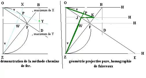 Dans le plan de cette figure considéré comme plongé dans un plan projectif fondamental, on peut établir une (parmi d'autres possibles) transformation homographique entre les deux êtres mathématiques unidimensionnels que sont les faisceaux de centre Z et O. Ceci en se dispensant de travailler sur les échelles de points X et Y. On utilisera H, le point à l'infini dans la direction de l'axe OX et le faisceau de droites de centre H, c’est-à-dire le faisceau des droites parallèles à OX.