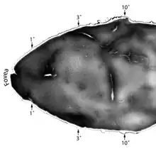 Appliquée au cortex strié[4],[3], cette technique de coloration révèle une activité métabolique répartie en une mosaïque de taches, riches en CO, régulièrement réparties sur la surface (fig. 6). Les régions à haute activité sont appelées blobs ou patches, taches ou amas en français, et les régions plus claires, interblobs, intertaches. Les blobs contiennent une prédominance[5] de cellules sensibles aux couleurs (et manquant d'une forte sélection à l'orientation) et les régions interblobs une prépondérance de cellules sensibles à l'orientation et aux contrastes de luminance (et non sensibles aux couleurs). Les blobs se connectent aux bandes fines de l'aire V2 et les interblobs aux bandes pâles et épaisses de V2. La ségrégation du traitement de la couleur et de l'orientation est donc conservée en passant dans l'aire V2.