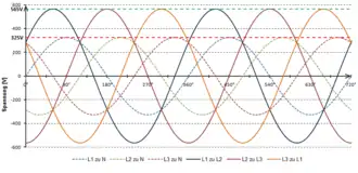 Les différences de potentiel entre chacune des phases et le neutre constituent un système de tensions triphasées notées généralement V (V1N, V2N, V3N) et appelées tensions simples, tensions étoilées ou tensions de phase. Dans le cas de distributions équilibrées, l'amplitude des tensions de phase est identique.