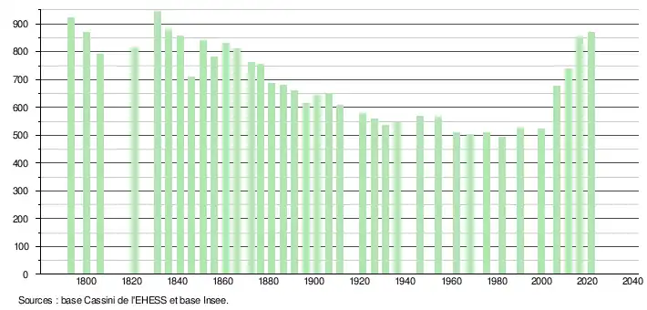 L'évolution du nombre d'habitants est connue à travers les recensements de la population effectués dans la commune depuis 1793. Pour les communes de moins de 10 000 habitants, une enquête de recensement portant sur toute la population est réalisée tous les cinq ans, les populations légales des années intermédiaires étant quant à elles estimées par interpolation ou extrapolation[18]. Pour la commune, le premier recensement exhaustif entrant dans le cadre du nouveau dispositif a été réalisé en 2006[19].