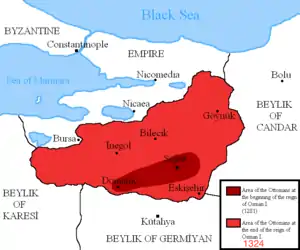 En 1299, Osman Ier conquiert la ville byzantine de Mocadène, aujourd’hui Bilecik. Cette date marque le début de l’État ottoman et de la constitution de la première armée ottomane. Jusqu’à sa mort en 1326, Osman Ier conquiert plusieurs autres villes et places fortes byzantines, ainsi que certaines principautés turques voisines. Osman est acclamé comme khan de la tribu du Kayıhan, titre qu'il porte jusqu'à sa mort[29].