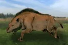 - Archaeotherium a vécu en Amérique du Nord de l'Oligocène au Miocène. Son crâne était large et solide, avec un cerveau plutôt petit. De la taille d'un bœuf, il semble avoir été un animal très agressif, les mâles s'opposant en terribles combats pour accéder aux femelles. Carnassier, il devait surtout se nourrir de charognes. Il ressemblait à un énorme phacochère ;