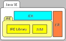 L'écriture de tels logiciels nécessite quant à elle l'utilisation d'un JDK (Java Development Kit), également distribué par Oracle Corporation. Ainsi, alors que JRE est destiné aux utilisateurs des programmes en langage Java, JDK est destiné aux programmeurs : il comporte en plus de la machine virtuelle et des bibliothèques, des commandes permettant la création de programmes en langage Java[3]. Ce même JDK est packagé dans diverses distributions, contenant des API complémentaires destinées à différents contextes de mise en œuvre : Java SE, Java EE, Java ME, etc.