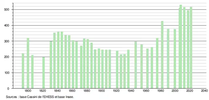 L'évolution du nombre d'habitants est connue à travers les recensements de la population effectués dans la commune depuis 1793. Pour les communes de moins de 10 000 habitants, une enquête de recensement portant sur toute la population est réalisée tous les cinq ans, les populations légales des années intermédiaires étant quant à elles estimées par interpolation ou extrapolation[25]. Pour la commune, le premier recensement exhaustif entrant dans le cadre du nouveau dispositif a été réalisé en 2007[26].