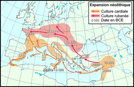 La population européenne se sédentarise entre 7 500 et 8 000 ans avant J.-C., par l'effet de diffusion de populations et de techniques apparues sur le plateau d'Anatolie vers 11 000 ans avant J.-C. et pratique l'agriculture à partir de 5 000 ans avant J.-C. Des hypothèses linguistiques et archéologiques ainsi que des études génétiques récentes accréditent la thèse d'un peuplement de l'ensemble du continent par des populations de l'est de l'Europe qui seraient les locuteurs du proto-indo-européen, langue-mère de la quasi-totalité des langues européennes.