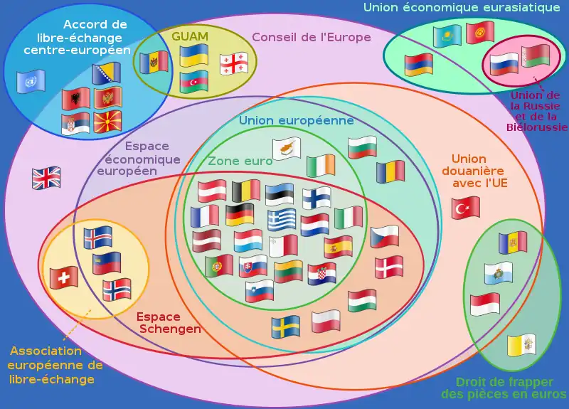 L'organisation de l'espace montre un cœur économique, la « banane bleue » ou mégalopole européenne, qui comprend notamment l'Europe rhénane ainsi que les périphéries européennes[26].