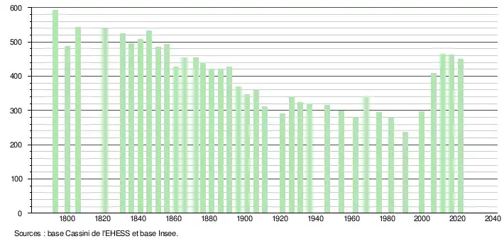 L'évolution du nombre d'habitants est connue à travers les recensements de la population effectués dans la commune depuis 1793. Pour les communes de moins de 10 000 habitants, une enquête de recensement portant sur toute la population est réalisée tous les cinq ans, les populations légales des années intermédiaires étant quant à elles estimées par interpolation ou extrapolation[38]. Pour la commune, le premier recensement exhaustif entrant dans le cadre du nouveau dispositif a été réalisé en 2006[39].
