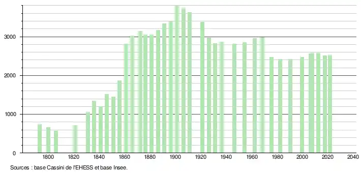 L'évolution du nombre d'habitants est connue à travers les recensements de la population effectués dans la commune depuis 1793. Pour les communes de moins de 10 000 habitants, une enquête de recensement portant sur toute la population est réalisée tous les cinq ans, les populations légales des années intermédiaires étant quant à elles estimées par interpolation ou extrapolation[21]. Pour la commune, le premier recensement exhaustif entrant dans le cadre du nouveau dispositif a été réalisé en 2007[22].
