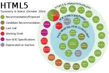 Le travail a été repris par le W3C en mars 2007 après avoir été lancé par le WHATWG. Les deux organisations travaillent en parallèle sur le même document afin de maintenir une version unique de la technologie. Le W3C clôt les ajouts de fonctionnalités le , annonçant une finalisation de la spécification en 2014[1], et encourage les développeurs Web à utiliser HTML5 dès ce moment. Fin 2016, la version 5.1 est officiellement publiée et présente plusieurs nouveautés qui doivent faciliter le travail des développeurs d'applications Web[2].