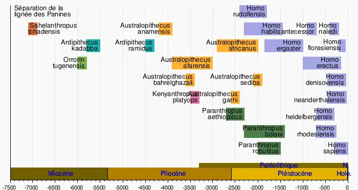 - Orrorin praegens (3,4 - 3 Ma)[7]