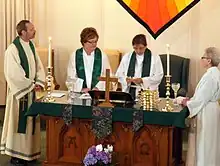 Aux États-Unis, différentes congrégations protestantes bénissent les unions homosexuelles[117] par des cérémonies en tous points semblables au mariage protestant. Les Églises unitariennes-universalistes, Église du courant unitarien-universaliste, bénit des couples du même sexe depuis les années 1970[117],[118]. Le synode général de l'United Church of Christ (UCC, Église unie du Christ, États-Unis) admit officiellement l'ordination d'homosexuels déclarés en 1980[119]. En 1991, ce même synode déclara qu'il « sout[enait] avec audace, célèbr[ait] et s'associ[ait] aux dons des personnes lesbiennes, gais et bisexuelles pour le ministère »[119].