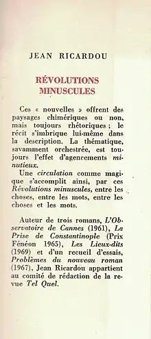 Parallèlement aux ensembles romanesques d’envergure, Ricardou publie régulièrement des textes plus brefs dans diverses revues et notamment dans Tel Quel. En 1971, il rassemble les plus importantes de ces “nouvelles” dans un recueil, intitulé ironiquement Révolutions minuscules[19]. Il paraît chez Gallimard, qui avait publié deux ans avant son récit le mieux reçu par la critique et les lecteurs : Les lieux-dits, petit guide d’un voyage dans le livre[20].