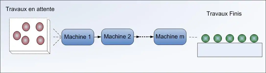 - le nombre de solutions possibles est de l’ordre de (n!)m, où n est le nombre de tâches à effectuer et m le nombre de machines. Notons qu’une tâche veut dire la même chose qu’un travail.