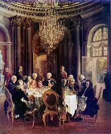 La cour de Frédéric II de Prusse avec le philosophe Voltaire.