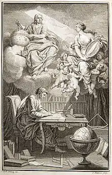 Image de couverture de l'interprétation par Voltaire de l'œuvre d'Isaac Newton, Éléments de la philosophie de Newton, mis à la portée de tout le monde (1738). Le manuscrit du philosophe assis, qui traduit l'œuvre de Newton, semble « éclairé » par une « lumière » quasi-divine venant de Newton lui-même, lumière réfléchie par le miroir tenu par une muse, en réalité la traductrice de l'œuvre de Newton, Émilie du Châtelet, maîtresse de Voltaire.