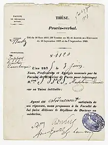 Madeleine Brès (1842-1921) est la première femme de nationalité française à accéder aux études de médecine en 1868, mais sans avoir le droit d'accéder aux concours. Elle obtient son doctorat en médecine, en 1875[21] et devient gynécologue et pédiatre. Elle démontre dans sa thèse que le lait du nourrisson se modifie au cours de l'allaitement et crée une des premières crèches parisiennes. Elizabeth Garrett Anderson, britannique la devance de cinq ans en France dans l'obtention de son doctorat[22].