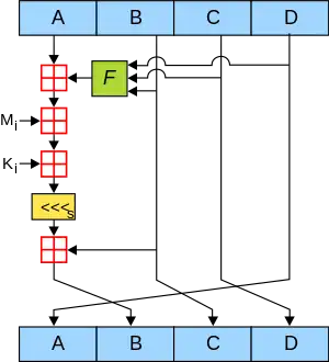 Une opération de MD5. MD5 comprend 64 blocs de ce type, groupés en quatre tours de 16 opérations. F est une fonction non linéaire, qui varie selon le tour. Mi symbolise un bloc de 32 bits provenant du message à hacher et Ki est une constante de 32 bits, différentes pour chaque opération.