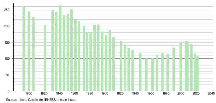 L'évolution du nombre d'habitants est connue à travers les recensements de la population effectués dans la commune depuis 1793. Pour les communes de moins de 10 000 habitants, une enquête de recensement portant sur toute la population est réalisée tous les cinq ans, les populations légales des années intermédiaires étant quant à elles estimées par interpolation ou extrapolation[20]. Pour la commune, le premier recensement exhaustif entrant dans le cadre du nouveau dispositif a été réalisé en 2008[21].
