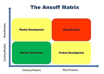 Selon Ansoff, il existe quatre stratégies de croissance : la pénétration de marché, l'extension de marché, le développement de produit, et la diversification[2].