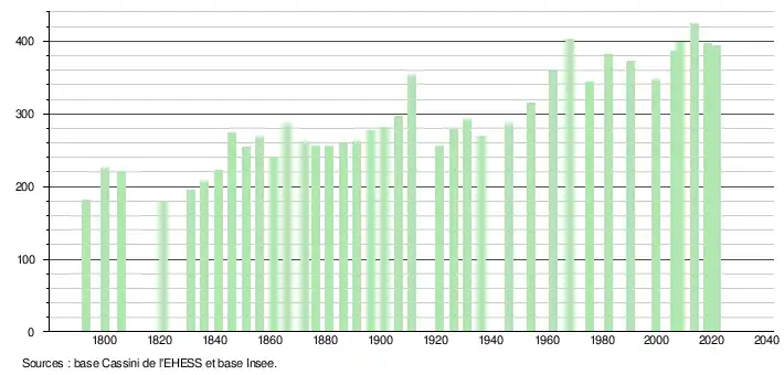 L'évolution du nombre d'habitants est connue à travers les recensements de la population effectués dans la commune depuis 1793. Pour les communes de moins de 10 000 habitants, une enquête de recensement portant sur toute la population est réalisée tous les cinq ans, les populations légales des années intermédiaires étant quant à elles estimées par interpolation ou extrapolation[20]. Pour la commune, le premier recensement exhaustif entrant dans le cadre du nouveau dispositif a été réalisé en 2008[21].