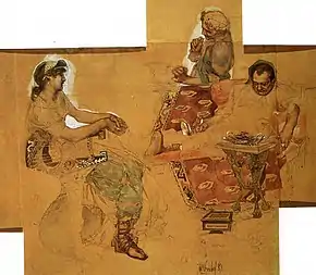 À Kiev, Vroubel entre en contact avec le cercle littéraire Ieronim Yasinsky (en). Il a fait connaissance également de Constantin Korovine. Malgré un travail intensif, Mikhaïl Alexandrovitch adopte une vie de bohème, fréquente assidument le cabaret Château de fleur. Cela absorbe tous ses petits gains et le salaire du travail que lui procure un raffineur de sucre Ivan Terechtchenko, qui lui donne aussi 300 roubles dès son arrivée à Kiev pour son tableau Conte oriental[53].