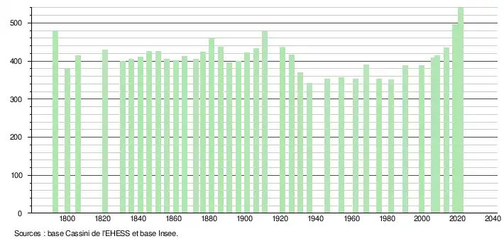 L'évolution du nombre d'habitants est connue à travers les recensements de la population effectués dans la commune depuis 1793. Pour les communes de moins de 10 000 habitants, une enquête de recensement portant sur toute la population est réalisée tous les cinq ans, les populations légales des années intermédiaires étant quant à elles estimées par interpolation ou extrapolation[29]. Pour la commune, le premier recensement exhaustif entrant dans le cadre du nouveau dispositif a été réalisé en 2008[30].