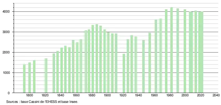 - Population municipale légale en vigueur au 1er janvier 2024, millésimée 2021, définie dans les limites territoriales en vigueur au 1er janvier 2023, date de référence statistique : 1er janvier 2021.