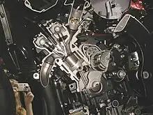 - une combustion à chaque tour moteur et une puissance spécifique (puissance/cylindrée) très élevée, donc une puissance massique très élevée ;