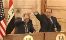Au cours d'une conférence de presse du président américain George W. Bush et du premier ministre irakien, au palais du premier ministre irakien à Bagdad le , Mountazer al-Zaïdi jette ses deux chaussures sur le président américain situé à quelques mètres, sans l'atteindre, et l'insulte en criant « C'est le baiser de l'adieu au nom du peuple irakien, espèce de chien ! »[3] puis « C'est pour les veuves et les orphelins et tous ceux tués en Irak ! »[3] George Bush esquive la première chaussure et le premier ministre irakien Nouri al-Maliki esquisse un geste de protection du président américain qui n'est pas touché sur le second lancer. Le journaliste est ensuite évacué de force par les services de sécurité irakiens et américains, en criant à l'adresse de George W. Bush : « Vous êtes responsable de la mort de milliers d'Irakiens ! »