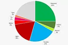 Part des groupes ethniques les plus nombreux ; peuples du nord en vert, peuples du sud-est en rouge, Yoruba en bleu[19].