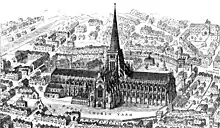 Le « vieux Saint-Paul » (Old St Paul's) tel qu’on nomme ce 4e édifice, était, avec ses 586 pieds (179 m), la troisième cathédrale la plus longue d'Europe et sa flèche culminait à 164 m[2]. Elle se dresse sur un vaste espace entouré de murailles qui suivent Creed Lane et Ave Maria Lane à l'ouest, Paternoster Row au nord, Old Change à l'est et Carter Lane au sud. Cette enceinte est alors percée de six portes.