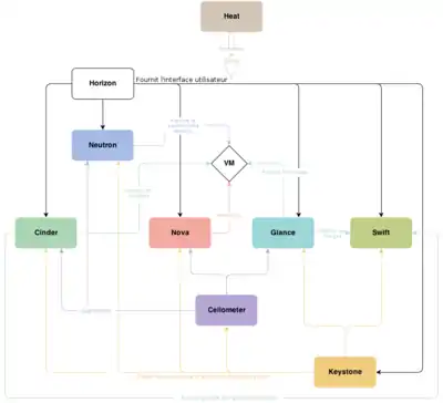 | Havana | [16] | Nova, Glance, Swift, Horizon, Keystone, Neutron, Cinder, Heat, Ceilometer | (en)Note de version Havana |