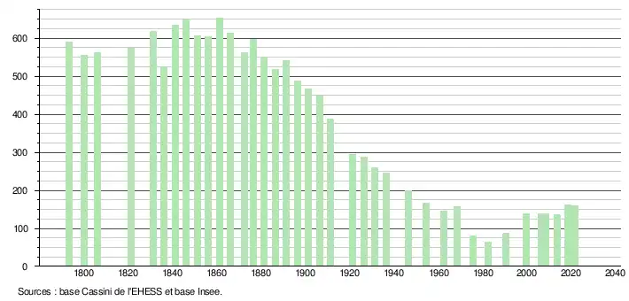 L'évolution du nombre d'habitants est connue à travers les recensements de la population effectués dans la commune depuis 1793. Pour les communes de moins de 10 000 habitants, une enquête de recensement portant sur toute la population est réalisée tous les cinq ans, les populations légales des années intermédiaires étant quant à elles estimées par interpolation ou extrapolation[18]. Pour la commune, le premier recensement exhaustif entrant dans le cadre du nouveau dispositif a été réalisé en 2008[19].