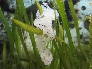 Elle pond en fin d'hiver près du fond ou des berges, ou dans certains embâcles, généralement sur des plantes aquatiques ou sur des branches immergées des rubans d’œufs[7]. Pour la pérennité de l'espèce, il est donc important de ne pas trop "nettoyer les cours d'eau" ou étangs au moment de la reproduction (printemps) et de ne pas retirer de l'eau ces branches qui servent de frayères où les œufs sont convenablement oxygénés et protégés des bactéries, invertébrés et sédiments.